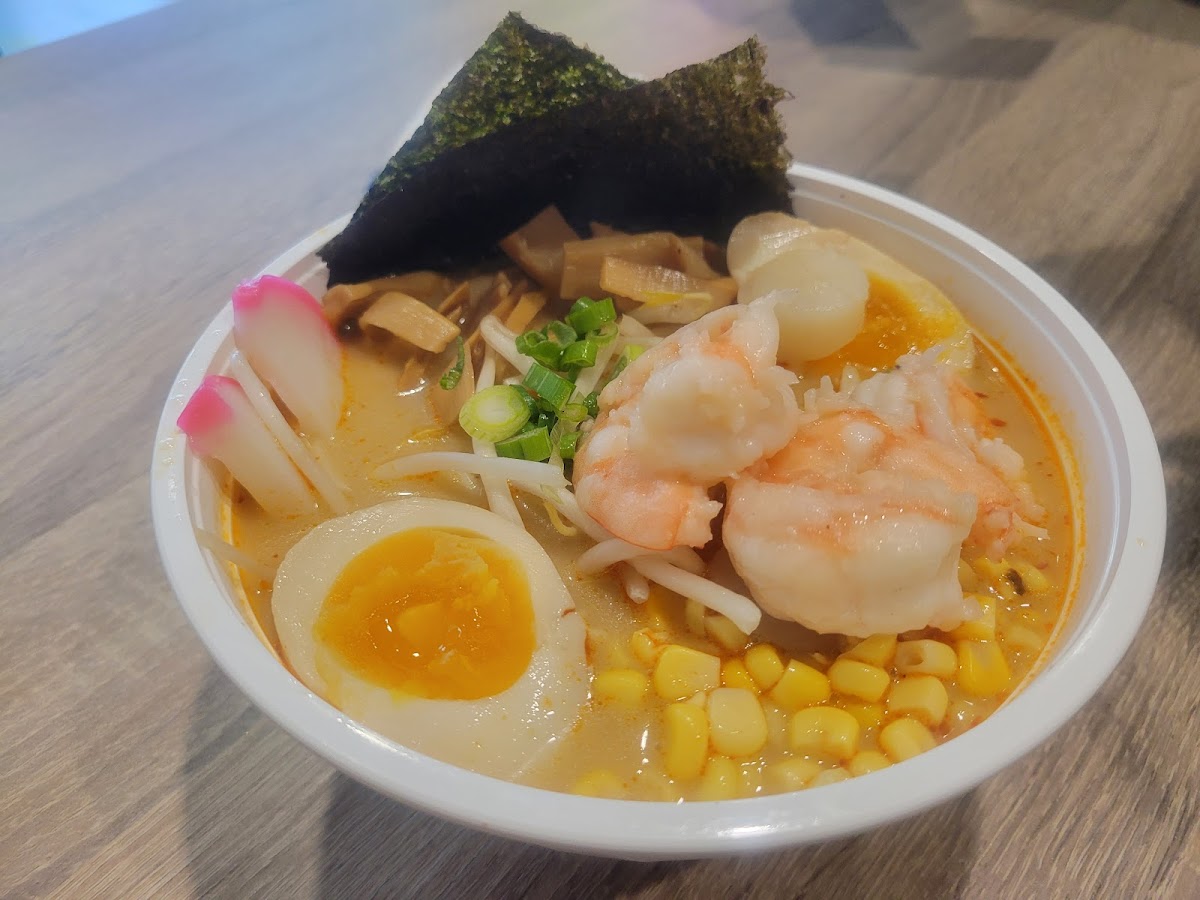 For something with a punch, try the Black Garlic Ramen. This bowl takes your taste buds on an adventure with its roasted pork and the delightful crunch of fried garlic. The additional toppings of green onions, corn, and bamboo shoots leave you craving more with every satisfying slurp.